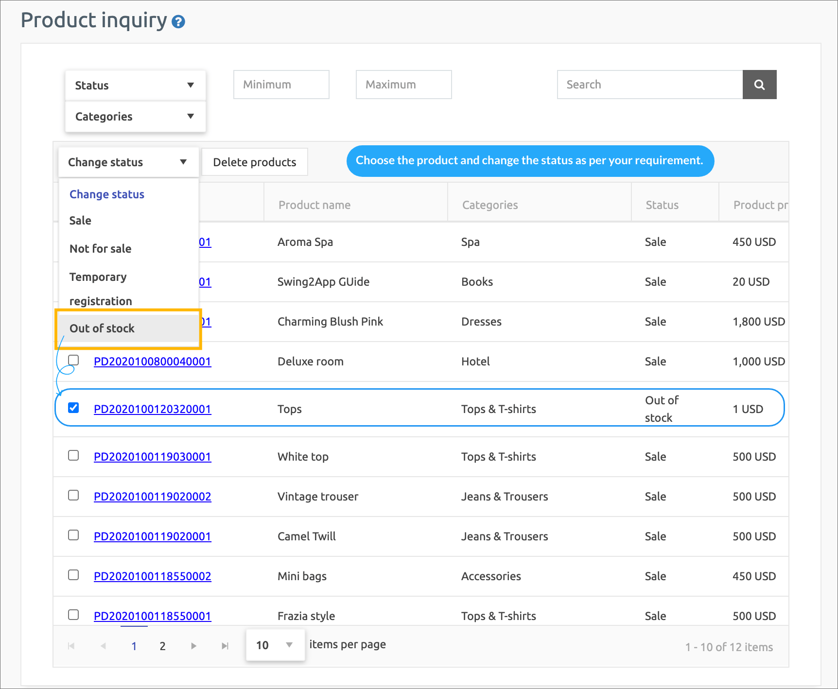 After checking the desired product and selecting [Out Of Stock] from [Change status], the status of the product will change from Available to-Out of Stock.