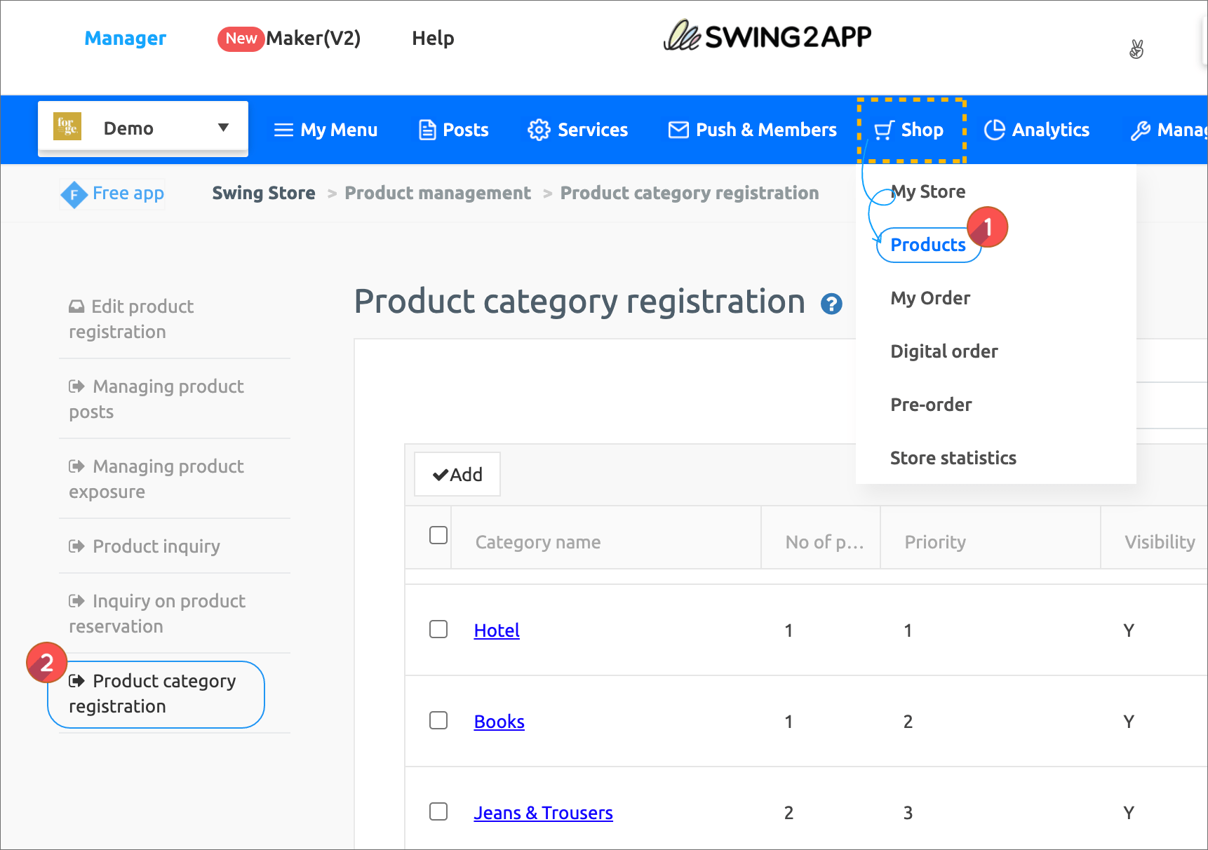 In the swing Shop menu, go to Products → Product Category Registration page.