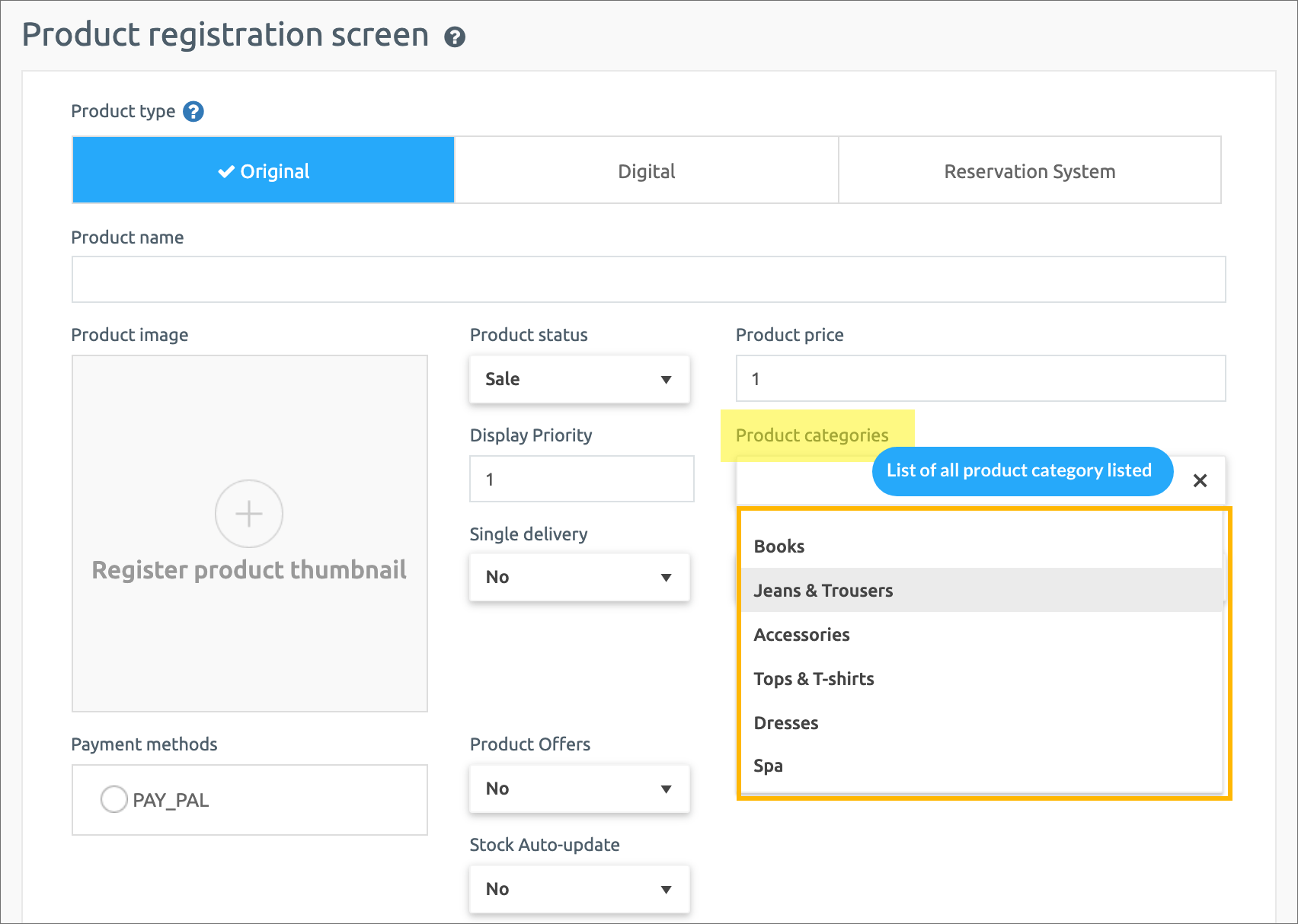 The Product Category Registration Management menu is where you create and apply the product categories you want to sell.
