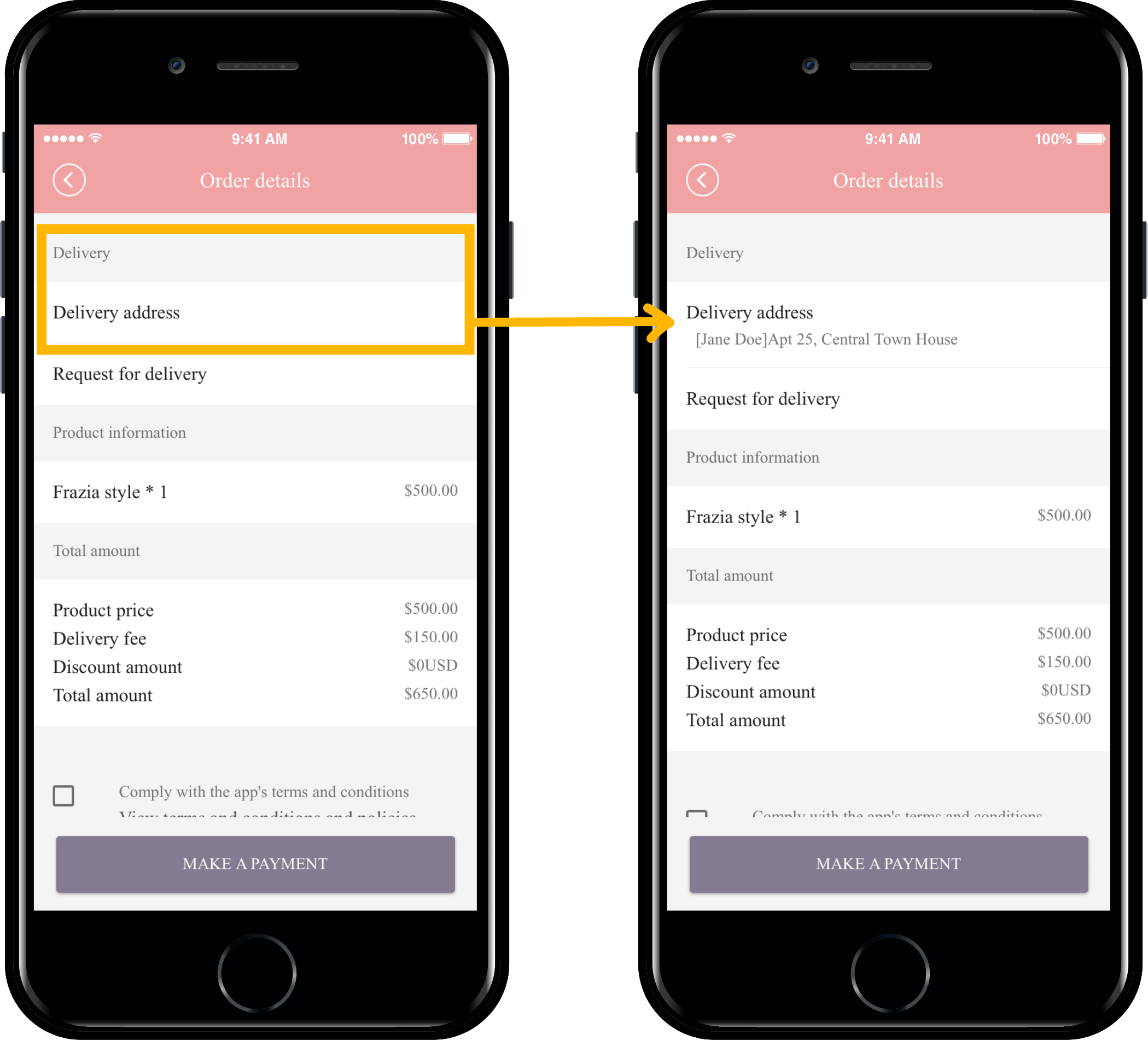 Users can place an order in the app and then check the order details page before payment.