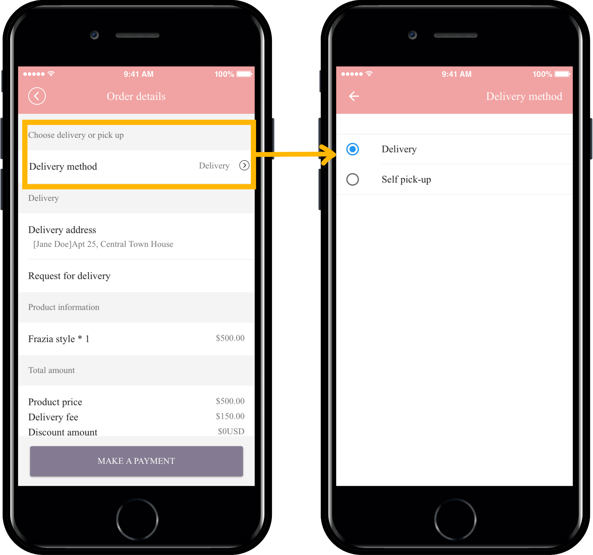 The contents of the order details page will change according to the selected delivery method.