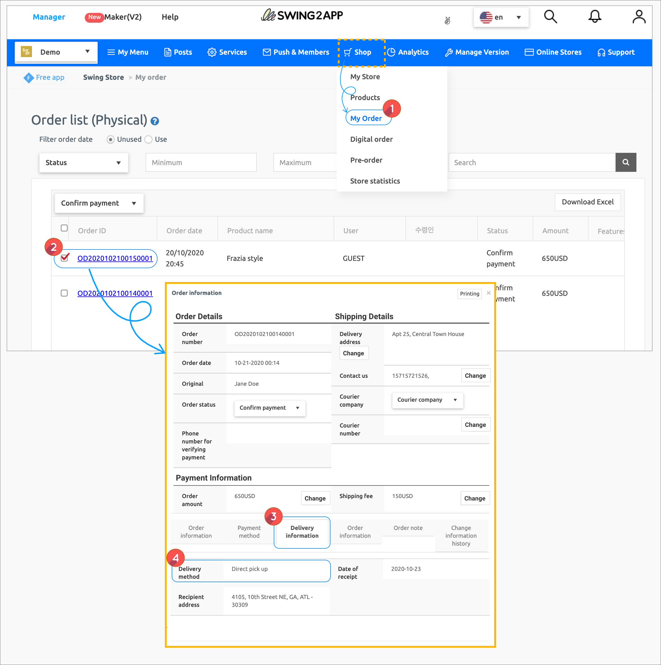 2) Select order ID to check order information