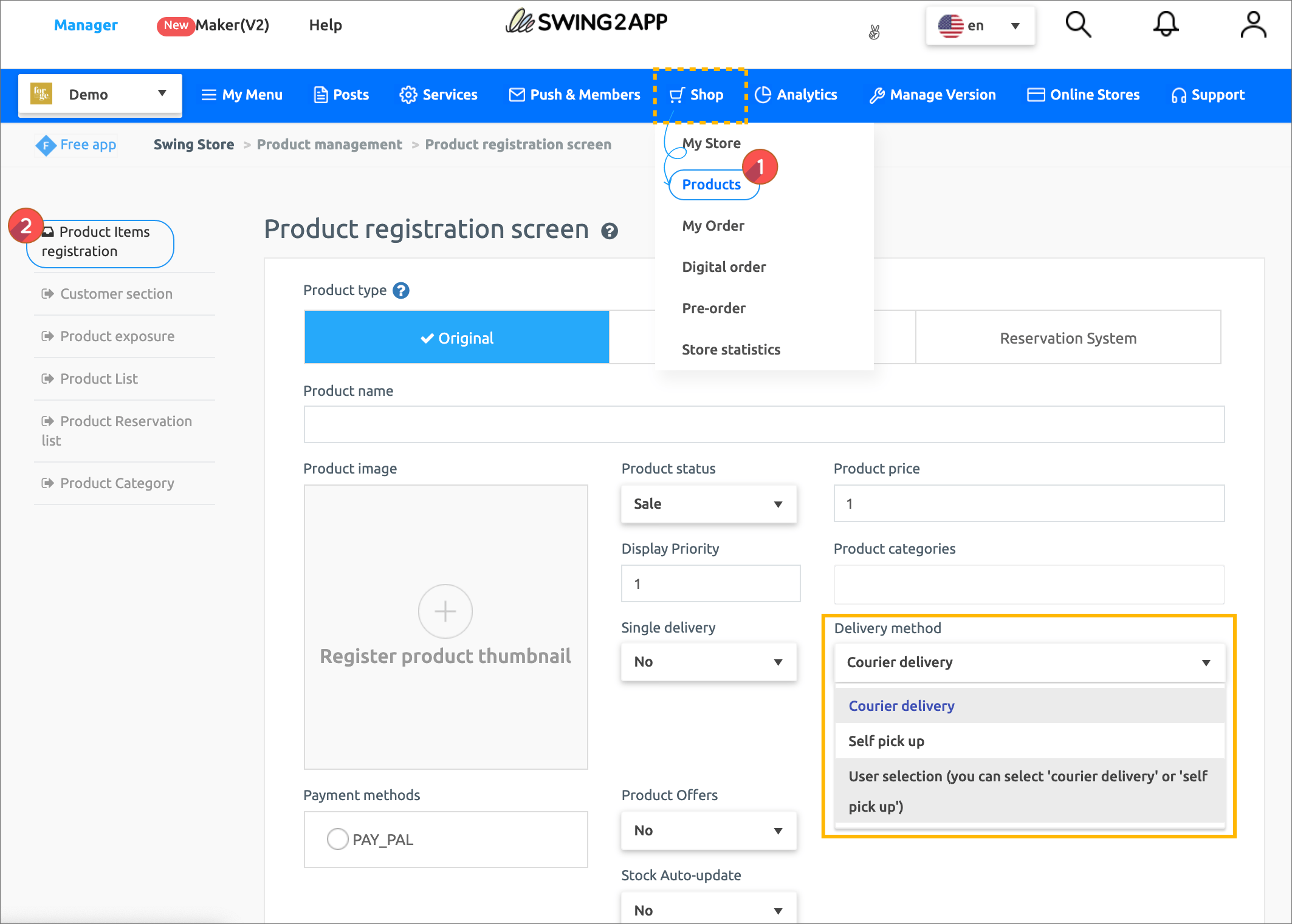Manager page → Shop → Products → Product item registration screen → select the method of Delivery method → press the Save button to complete.