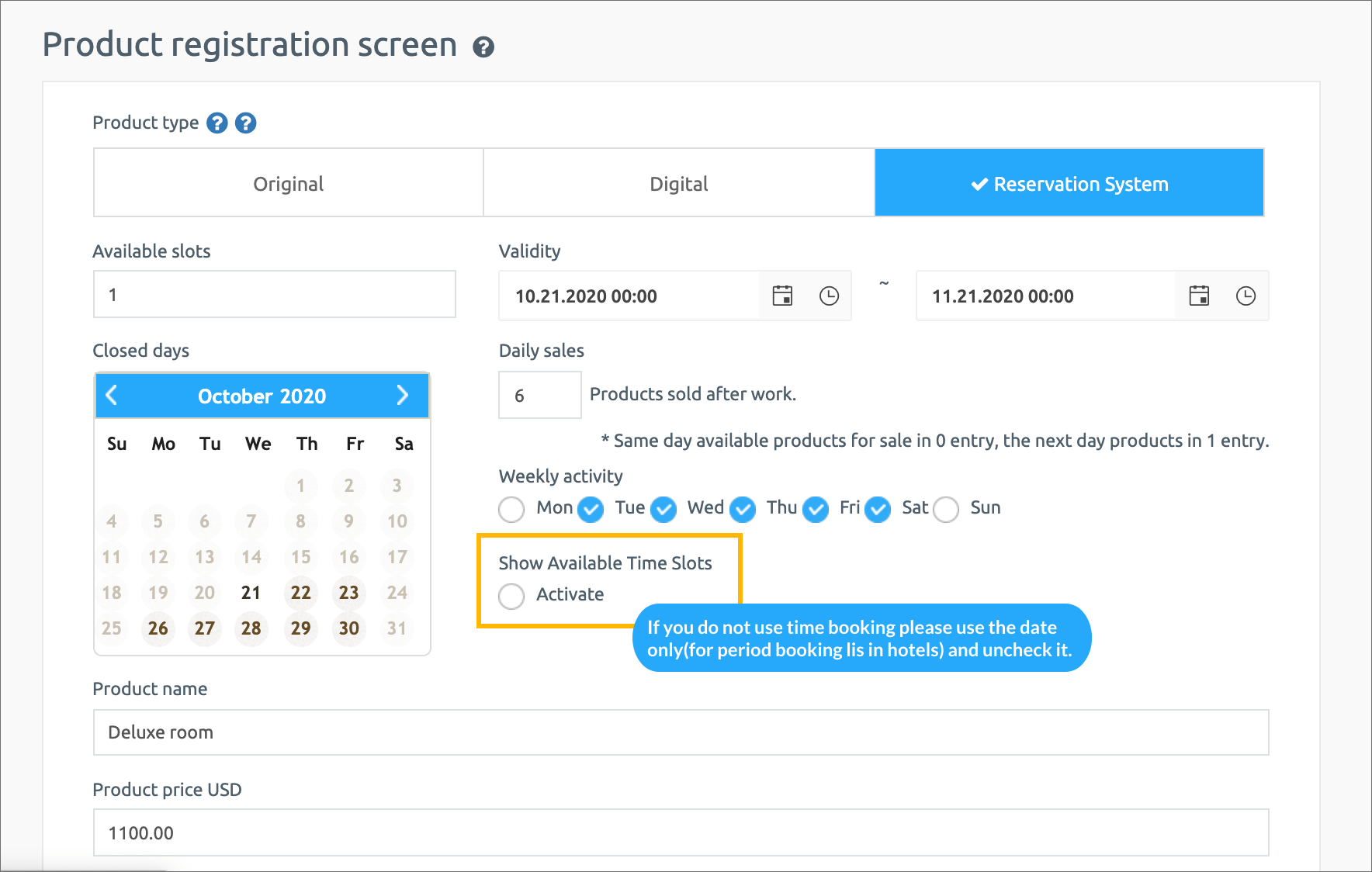 On the product registration page, select the product type: reservation system, and select the sales period and the available date.