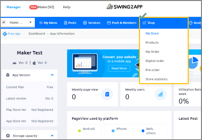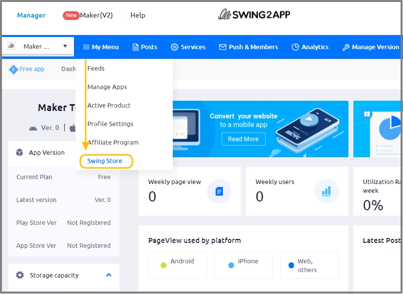You can apply for the Swing2App shopping mall service by selecting the Swing Homepage- Manager – My Menu – Swing Store menu.