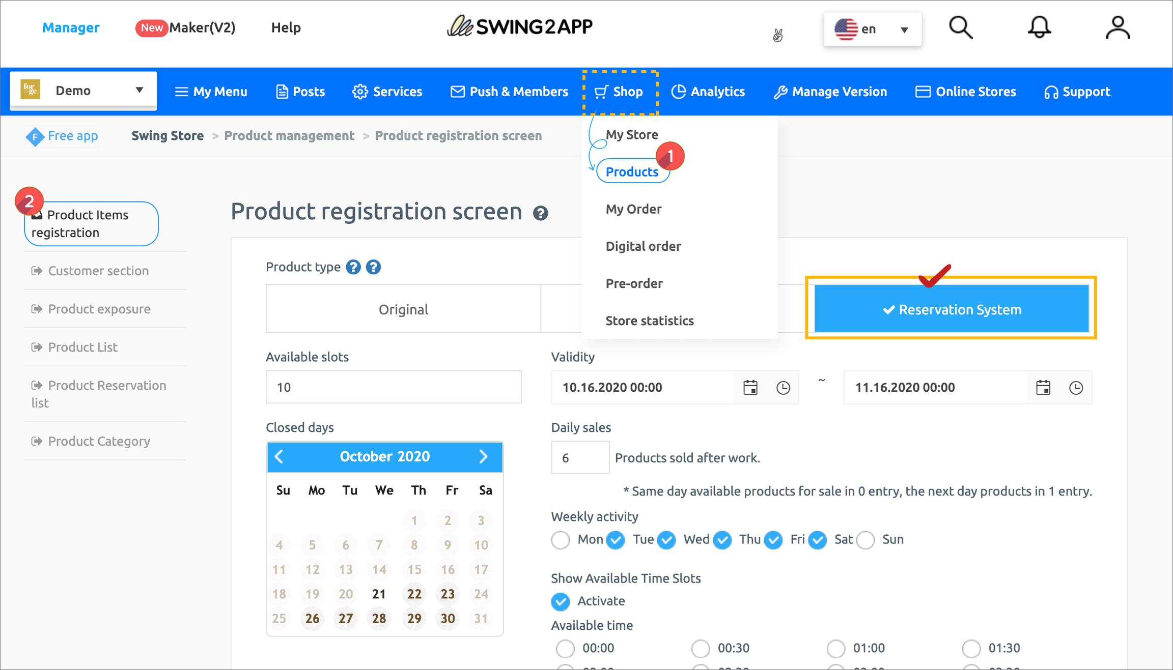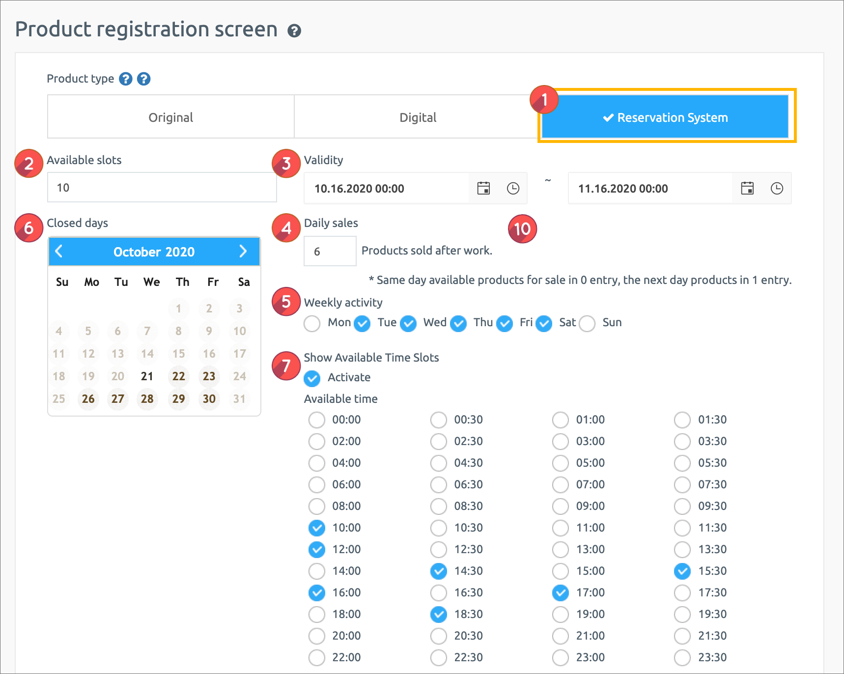 5. Weekly reservation activity: Select the day of the week to sell the product.