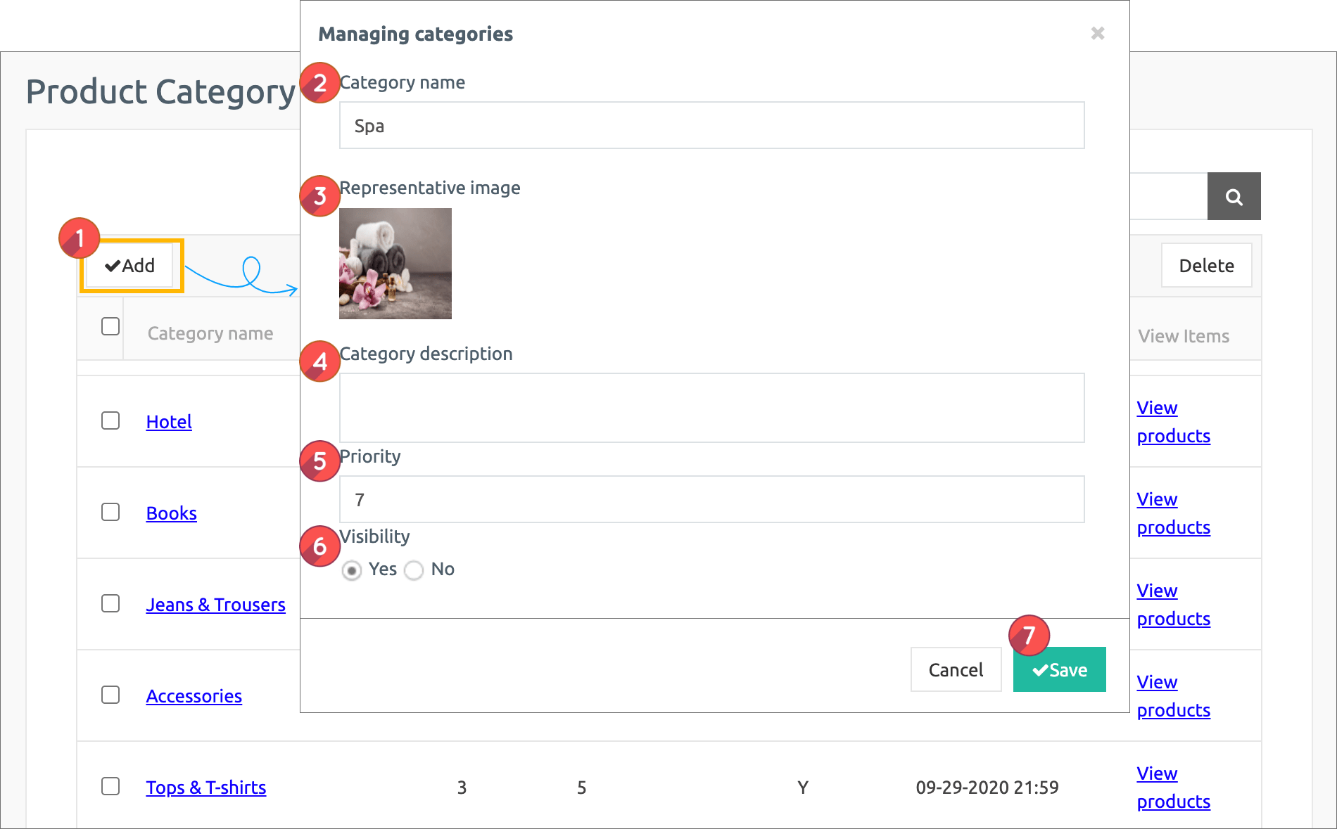 In the category management window, 2) Category name 2) Representative image 3) Category description 5) Priority 6) Check mark 7) Select the Save button.