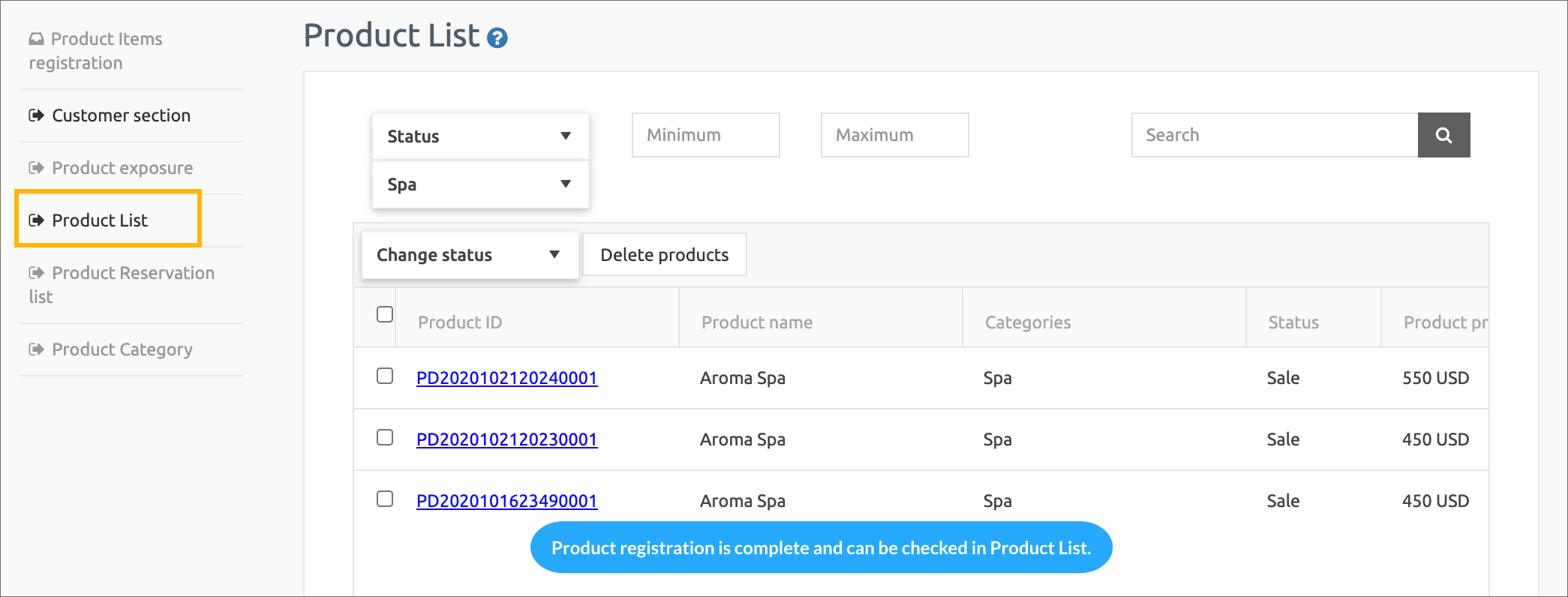 Product registration is complete. Registered products can be checked in product inquiry.