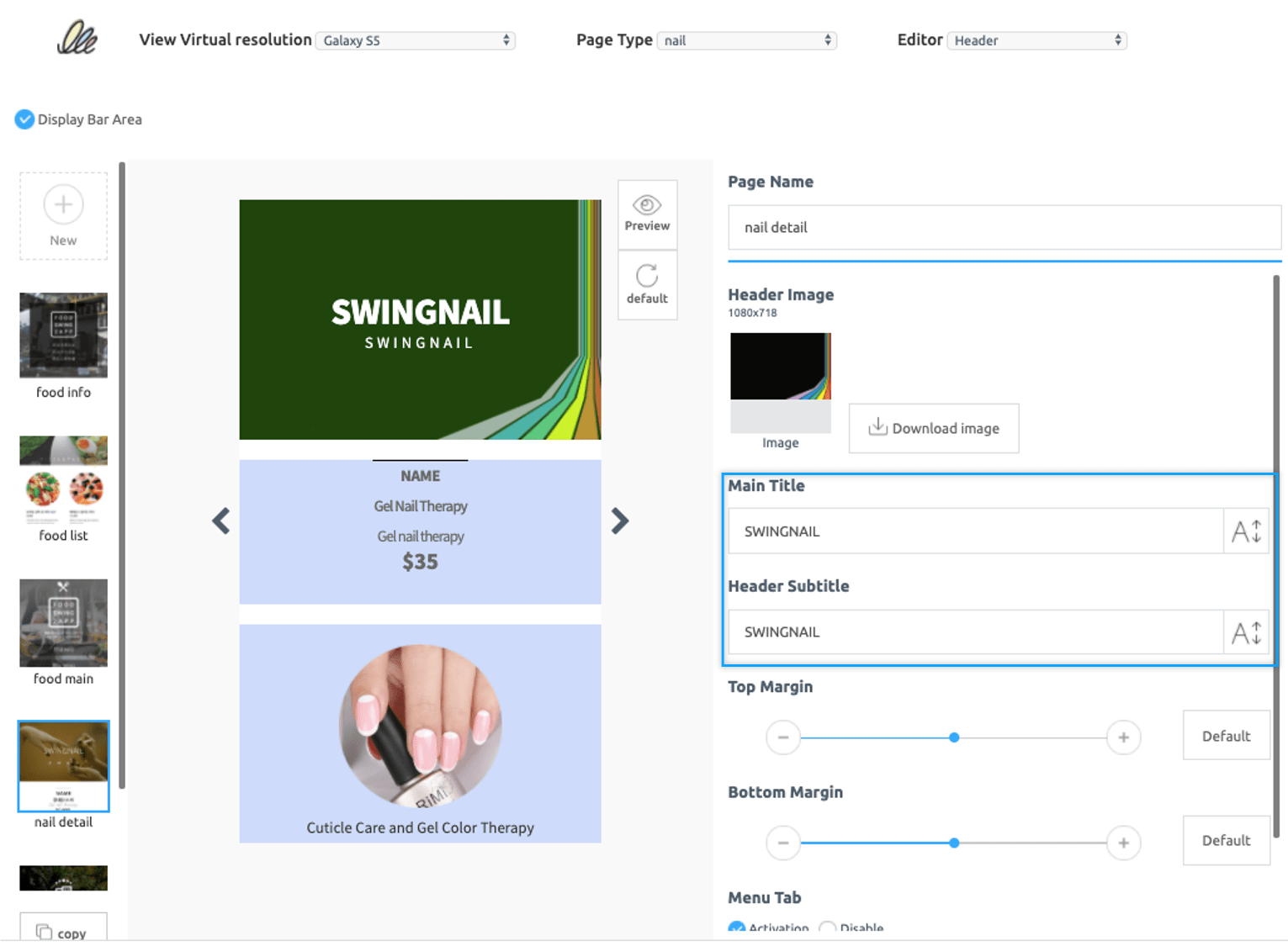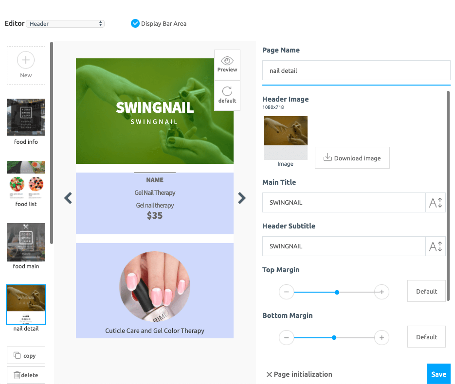 The nail-detail page has been opened. * The Web Template page is a tool for editing and applying images and text to the template tool provided by Swing2App. You can check the page edits on the left side of the screen, and edit the image and text to match the app’s personality on the web edit screen on the right.