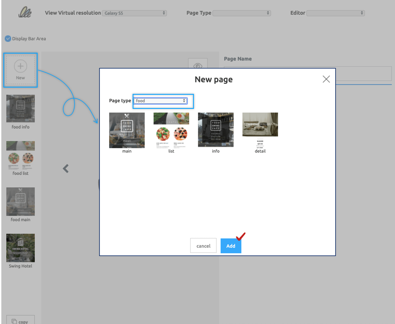 If you select the [+ New] button at the bottom, you can check the page tool types of various industries provided by Swing2App (10 industry templates available). Select the desired page and press the [Add] button. ** I have chosen the [Details] page of the nail industry here. There is no need to select the same page as the manual. You can select the page you want to work with according to the design of your app.\