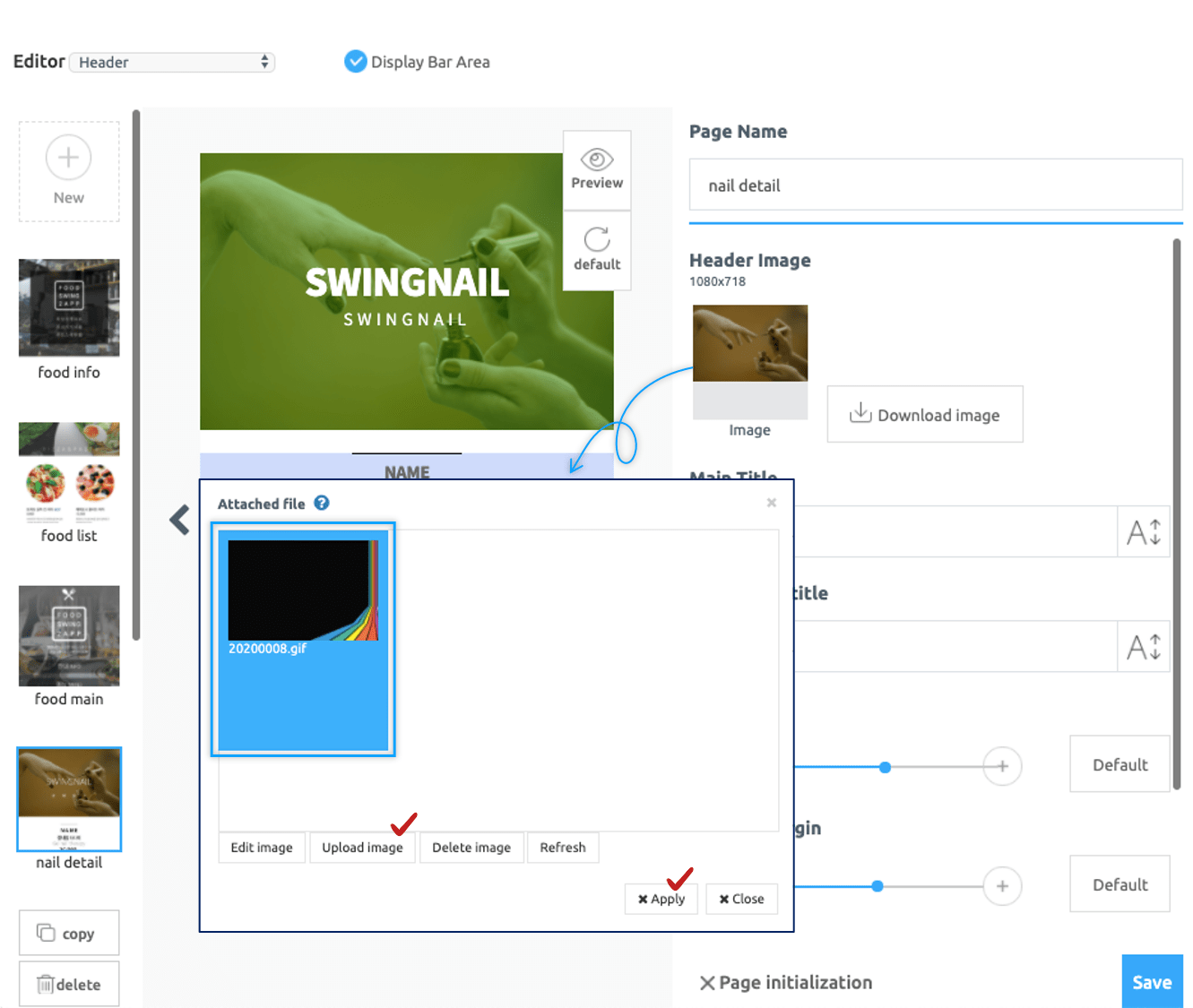 Selecting the header image part opens the file attachment window. Select [Upload] button here and select the desired image file and press [Apply].