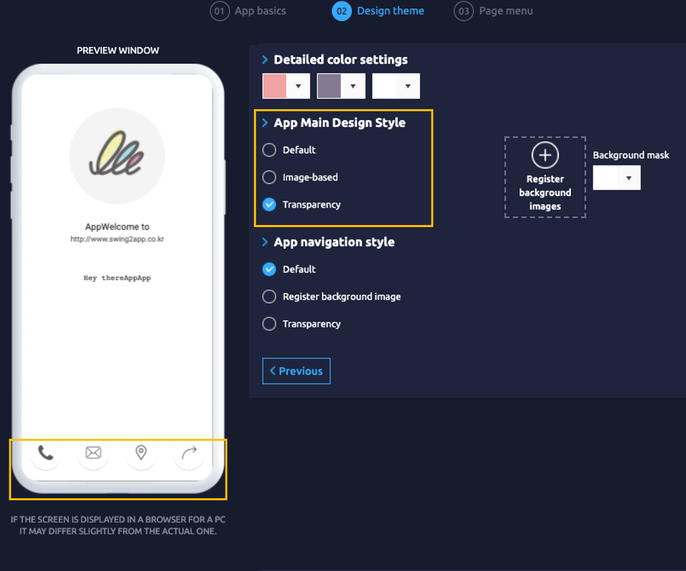 Instead of applying the app’s main design style, we’ll just place the image with the default settings. Then, as it is set from the original swing2app, the prototype: footer style is applied. As shown in the image above, a toolbar area is created at the top and bottom of the phone screen. The color set in the design theme is shown as it is. Doesn’t it look pretty if you have a bar area with colors that don’t match your home screen? 2) App main design style: Choose transparency