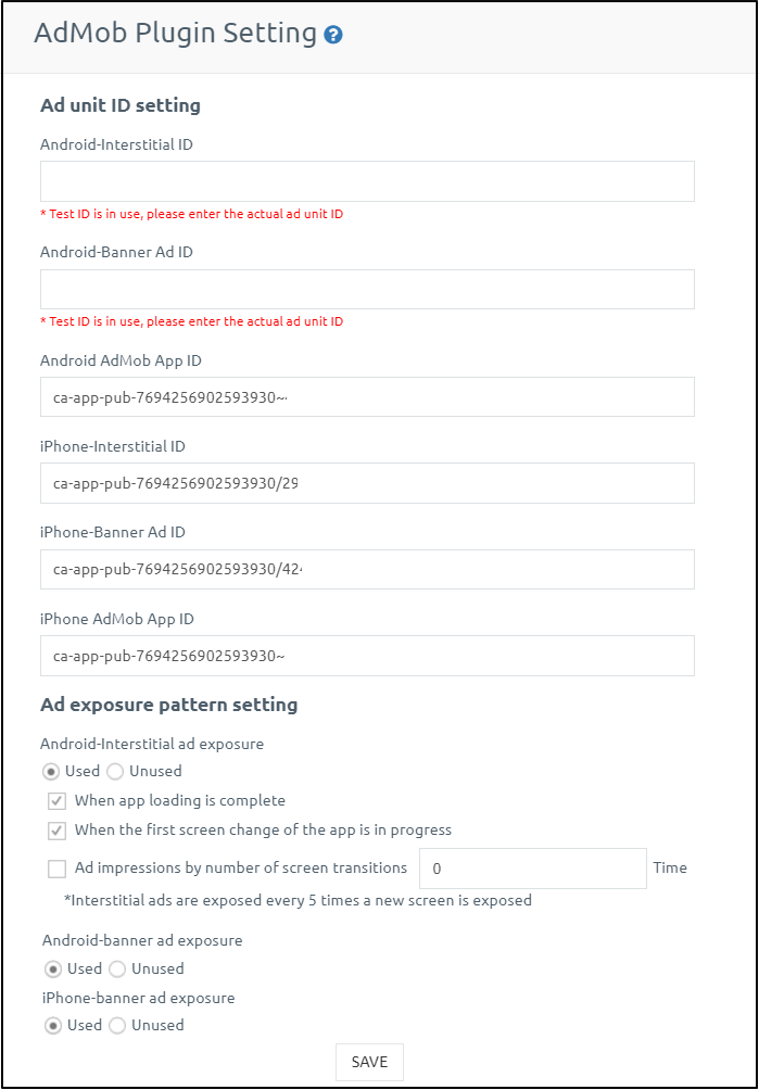 On the AdMob plugin setting screen, delete all IDs in the ID field, leave blank and save.