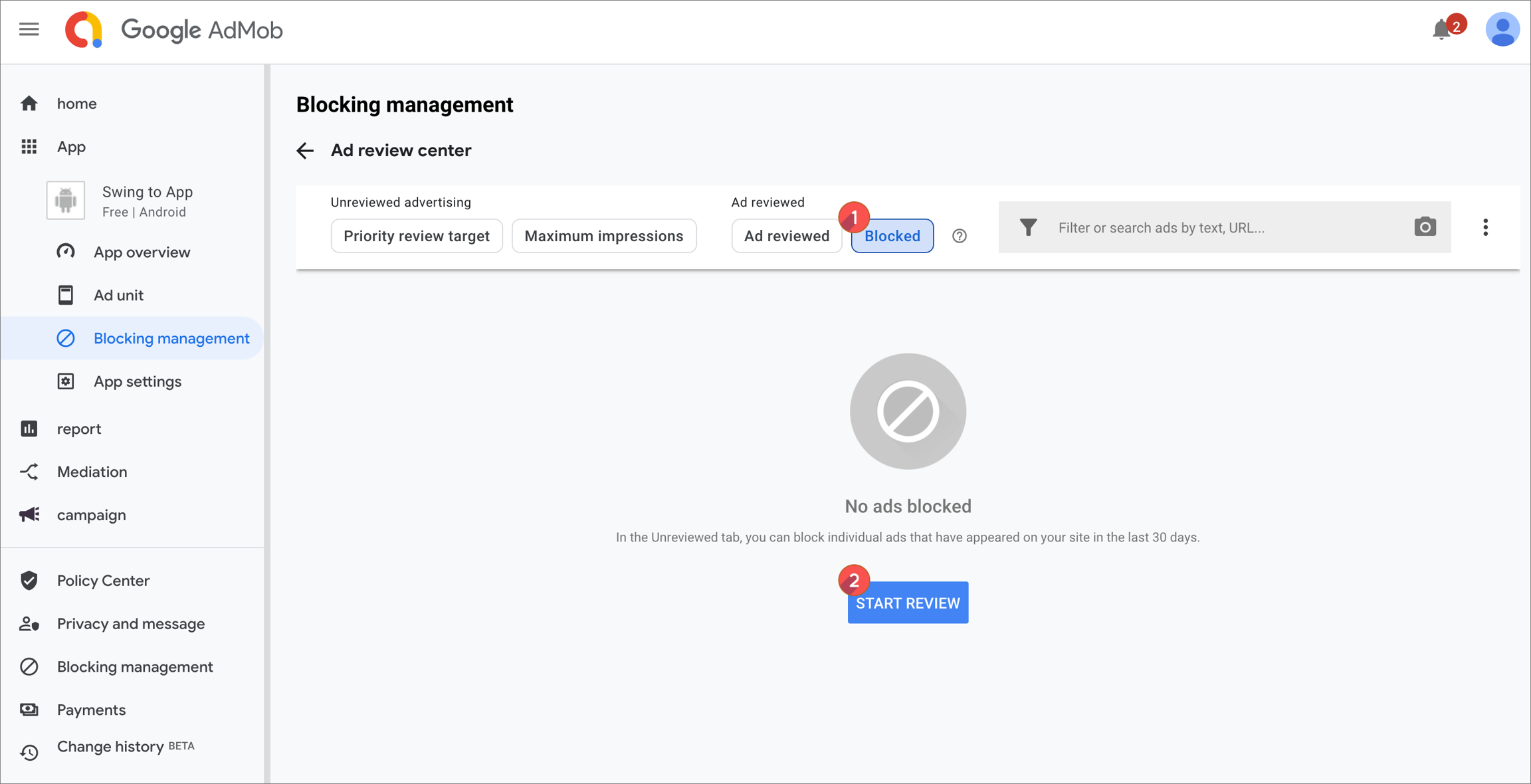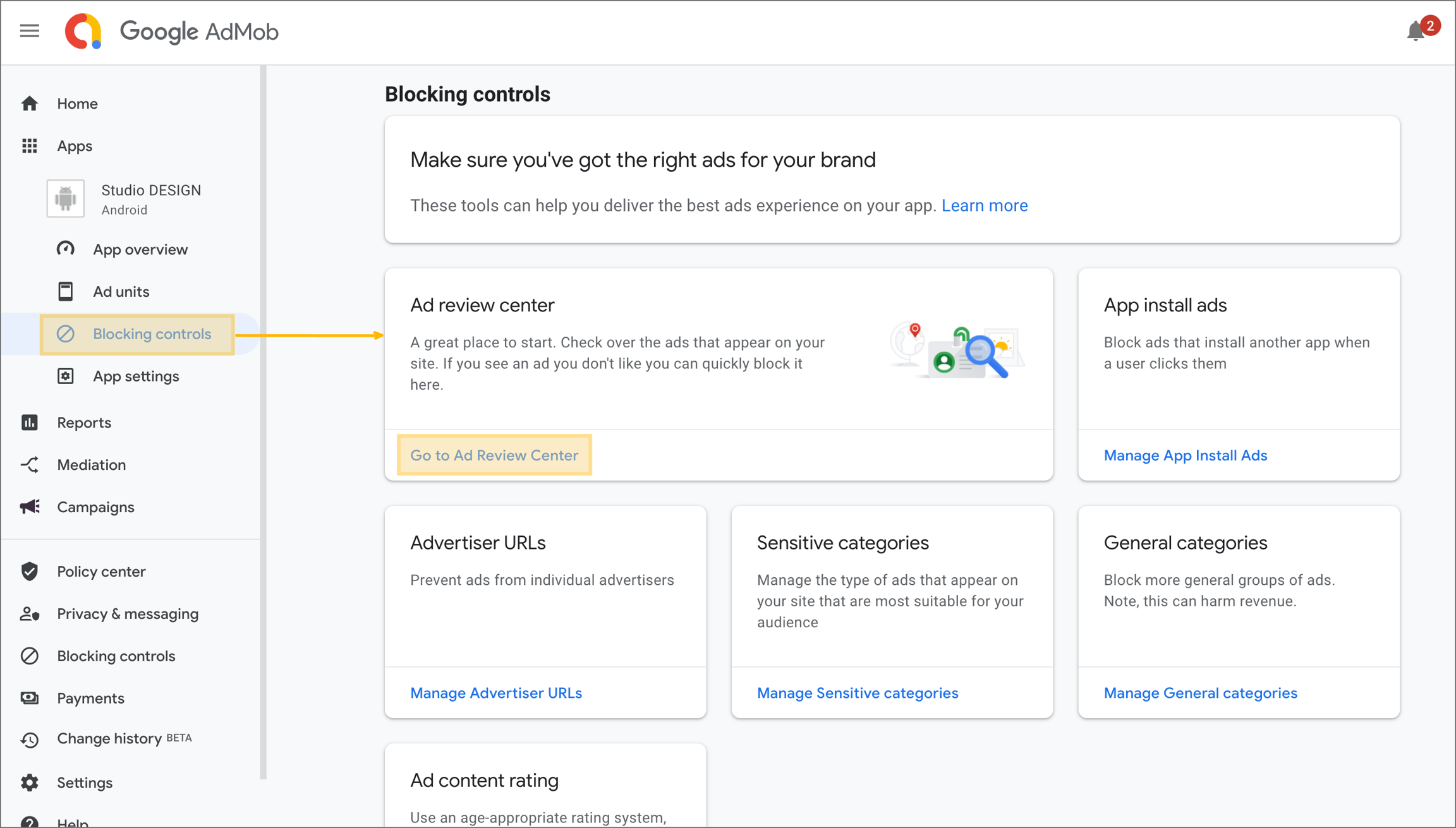 From the category on the left side of the AdMob dashboard, select Block Management → [Go to Ad Review Center].