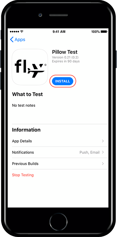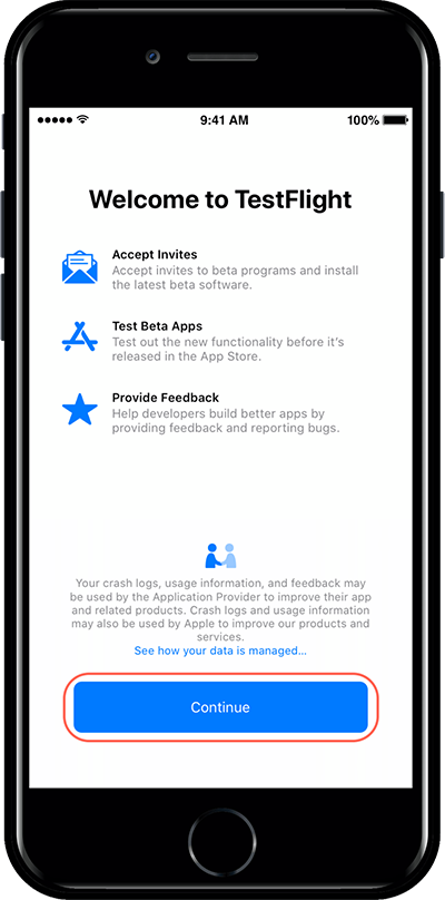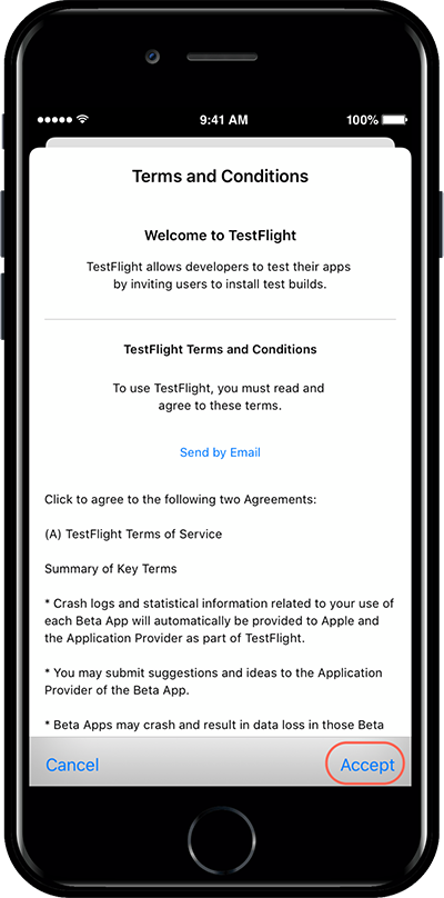 If you are using TestFlight for the first time, the Terms of Use page will appear first.