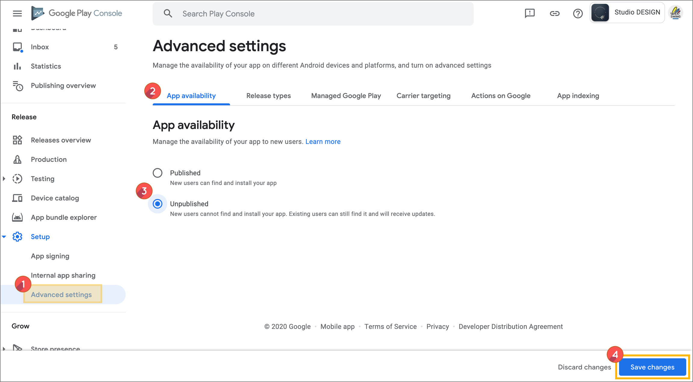 2) In the App Availability tab, check 3) Released.