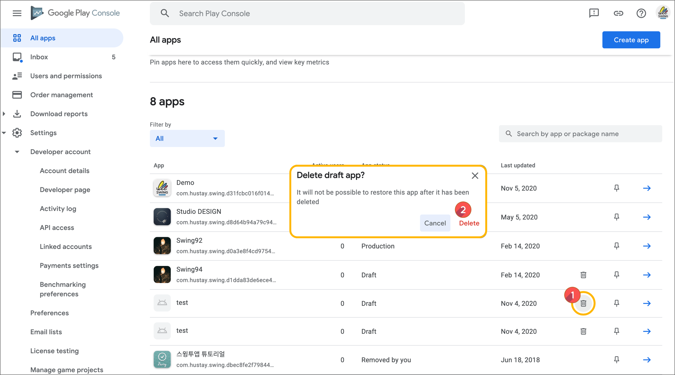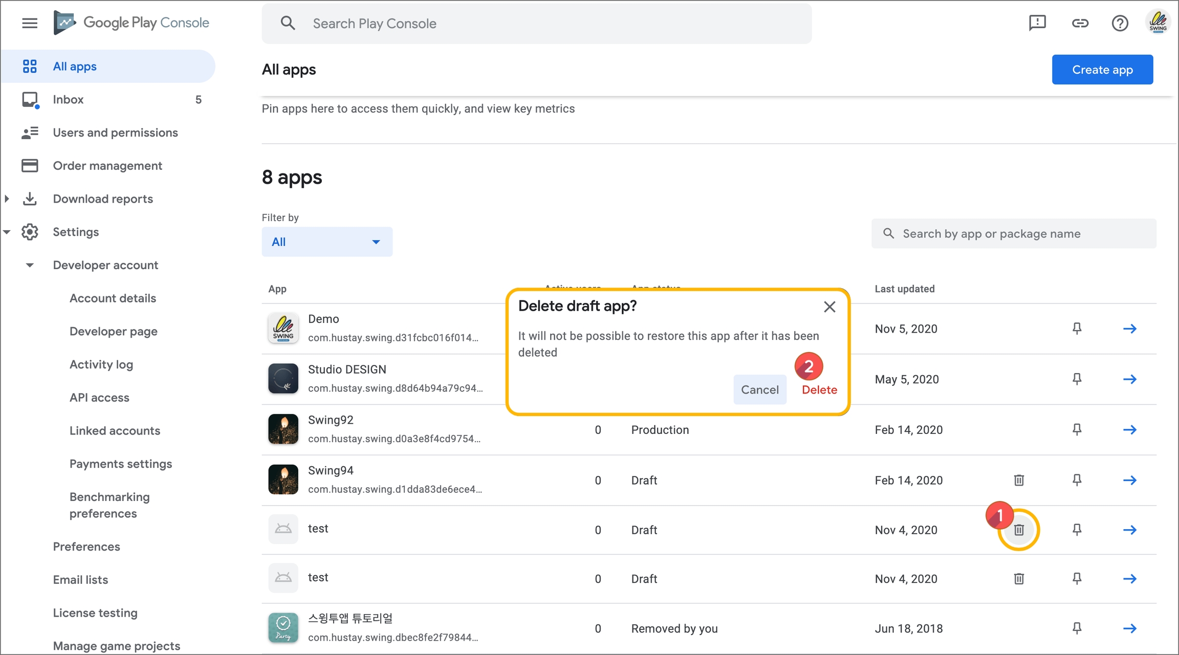 * Since the app is not released, the app is permanently removed immediately after deletion.