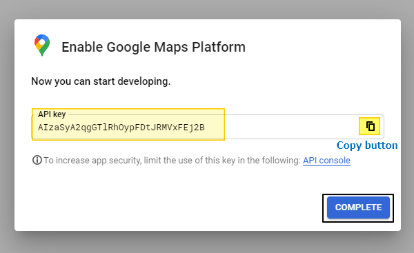 Copy the API key by selecting the copy icon from YOUR API KEY.
