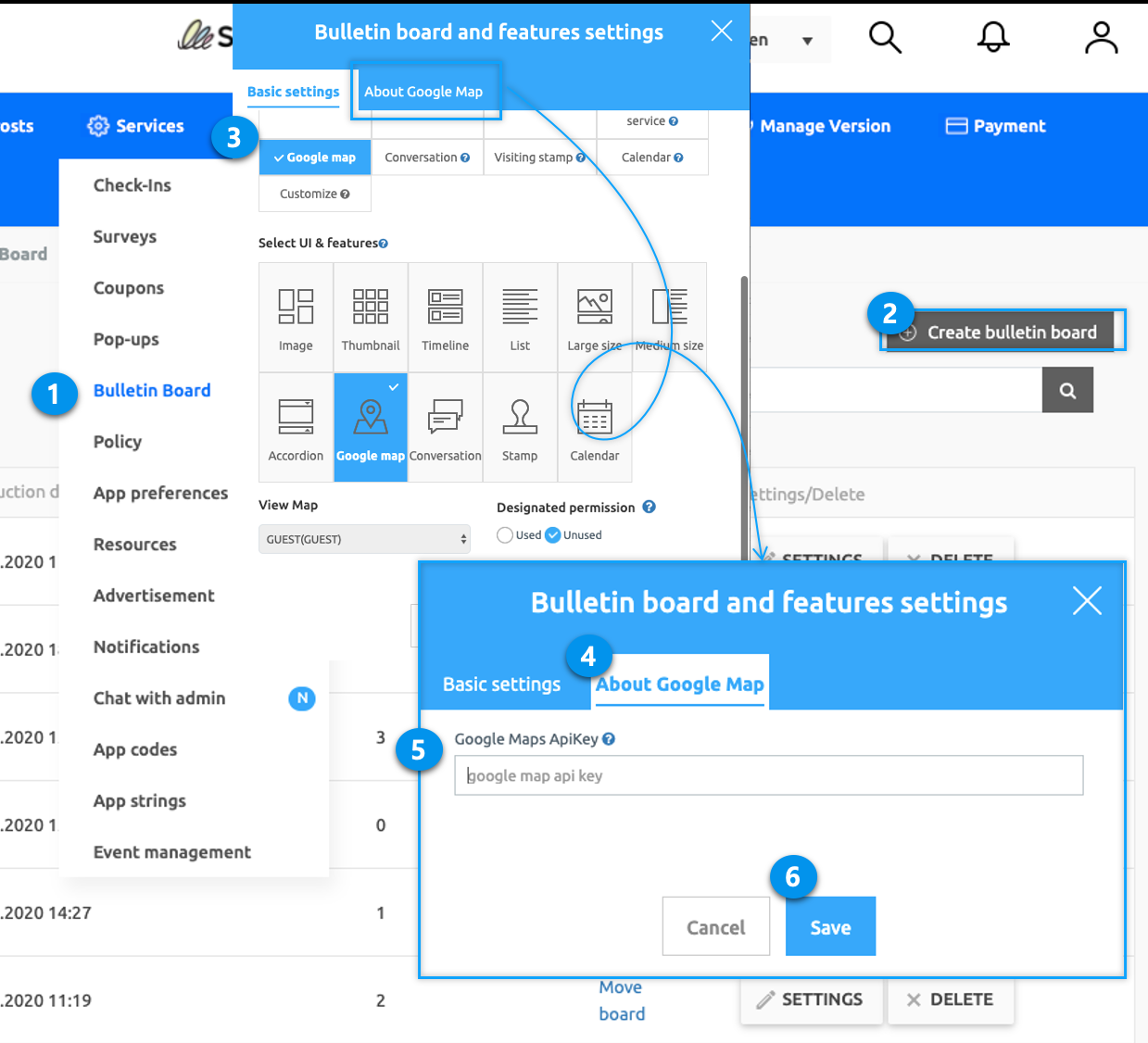 2) After selecting the bulletin board, go to [Google Map Information] and paste the copied API key and select Save.