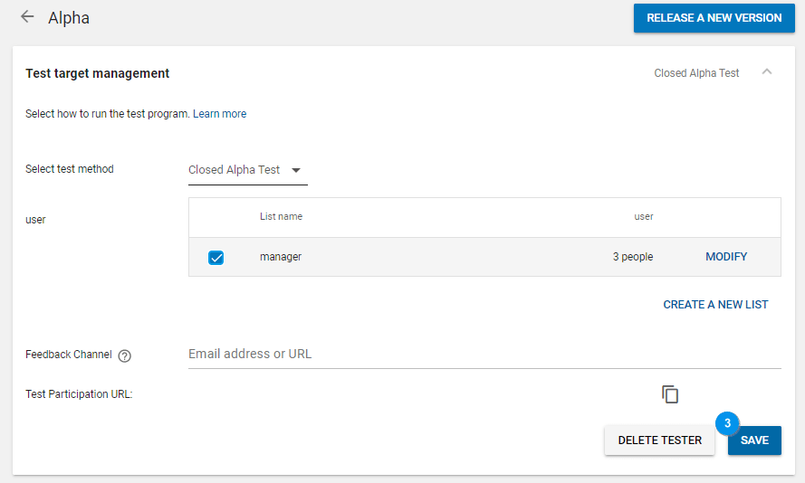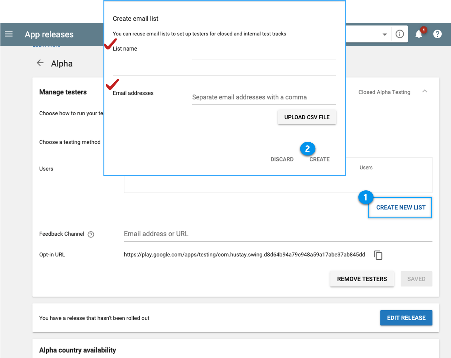 After you upload the APK file, create a list of users who can check the test version of the app.