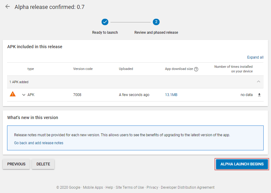 When the APK file upload is complete, select the [Start Alpha Release] button.