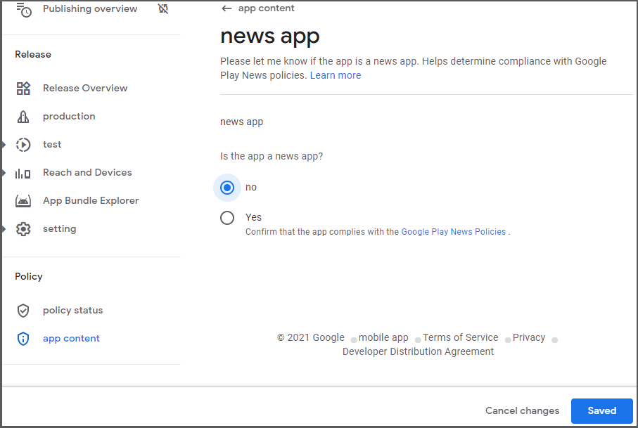 If the app you are submitting is not a news app, check “No” and click the Save button.
