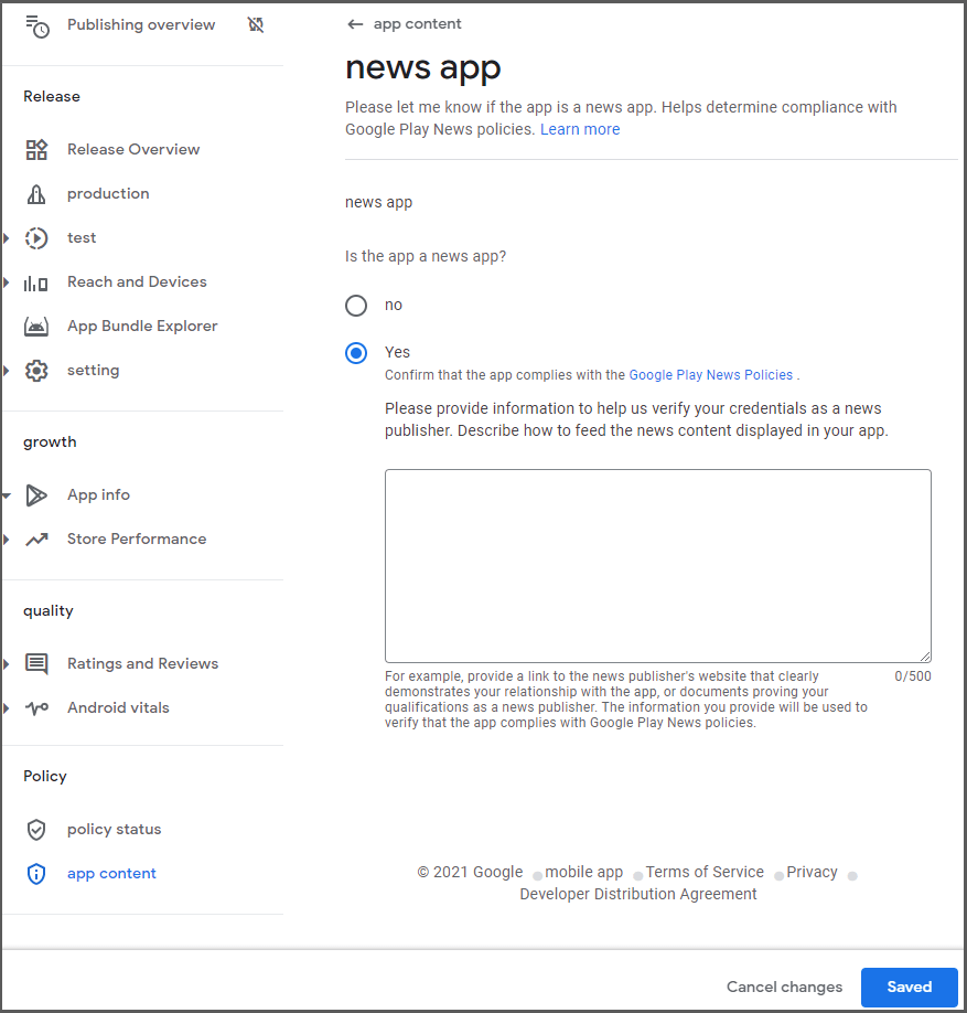 If the app you are submitting is a news app, you need to check “Yes” and fill out the content that proves the news app.