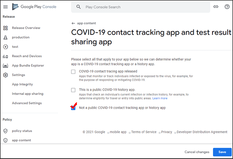 Check “Not a public COVID-19 contact tracking app or history app” and select the [Save] button.