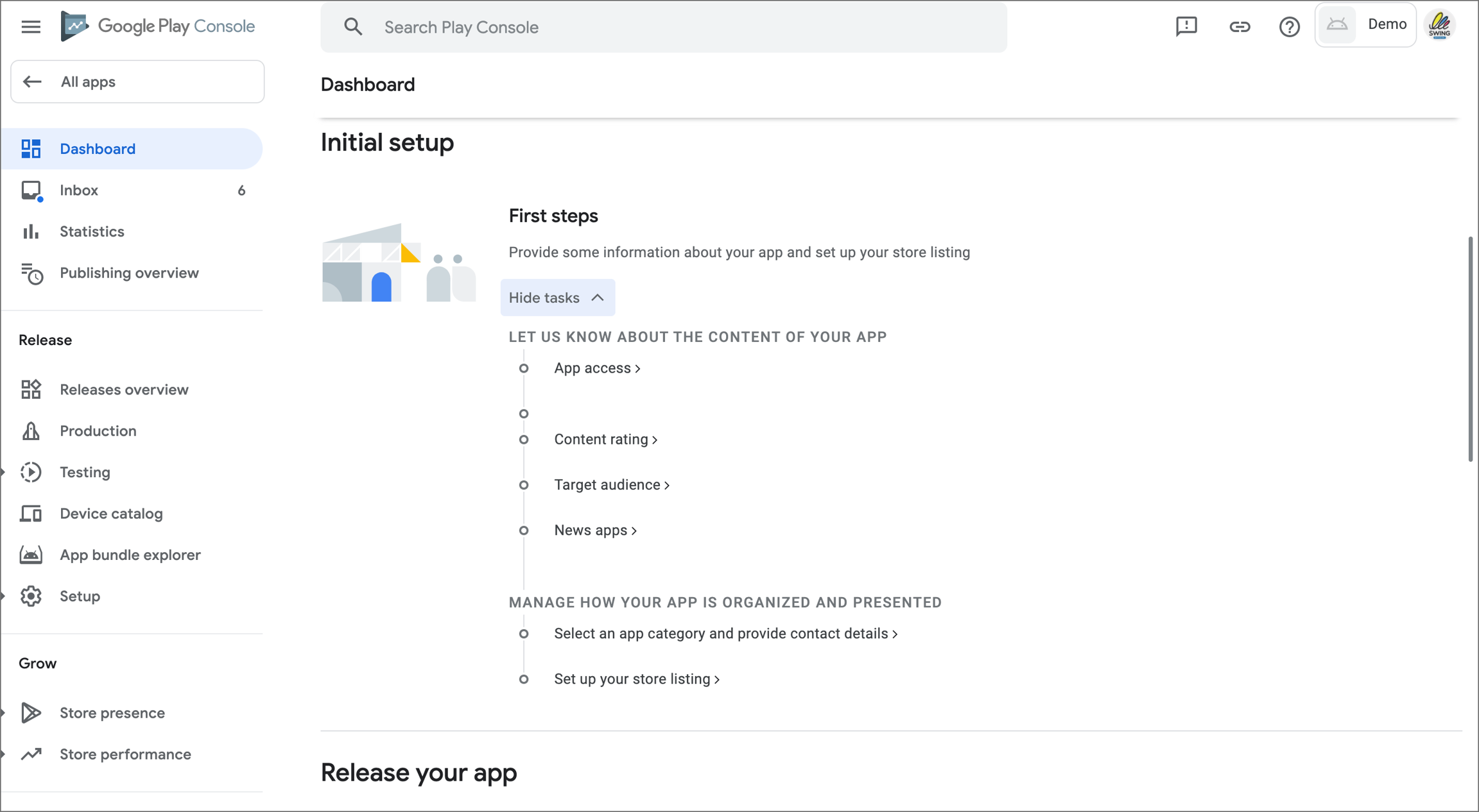 Open the Google Play console screen and the Swing2App site 2 screens.