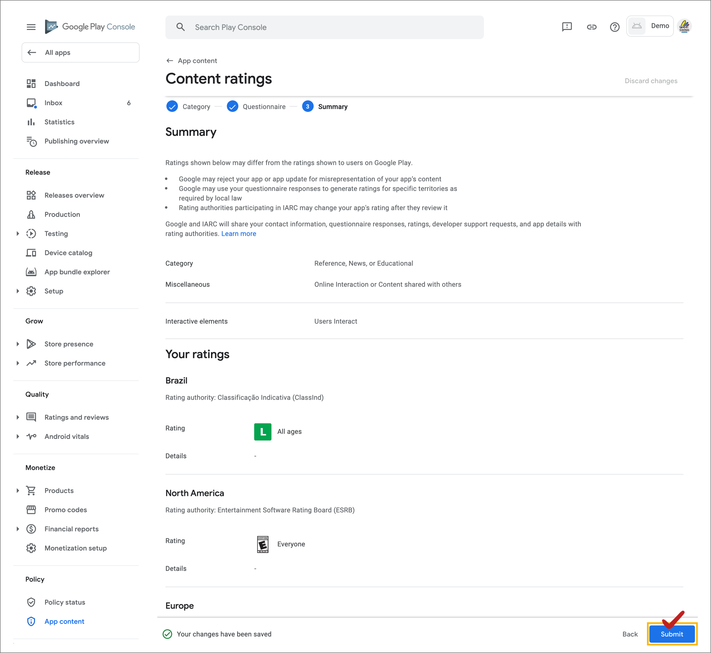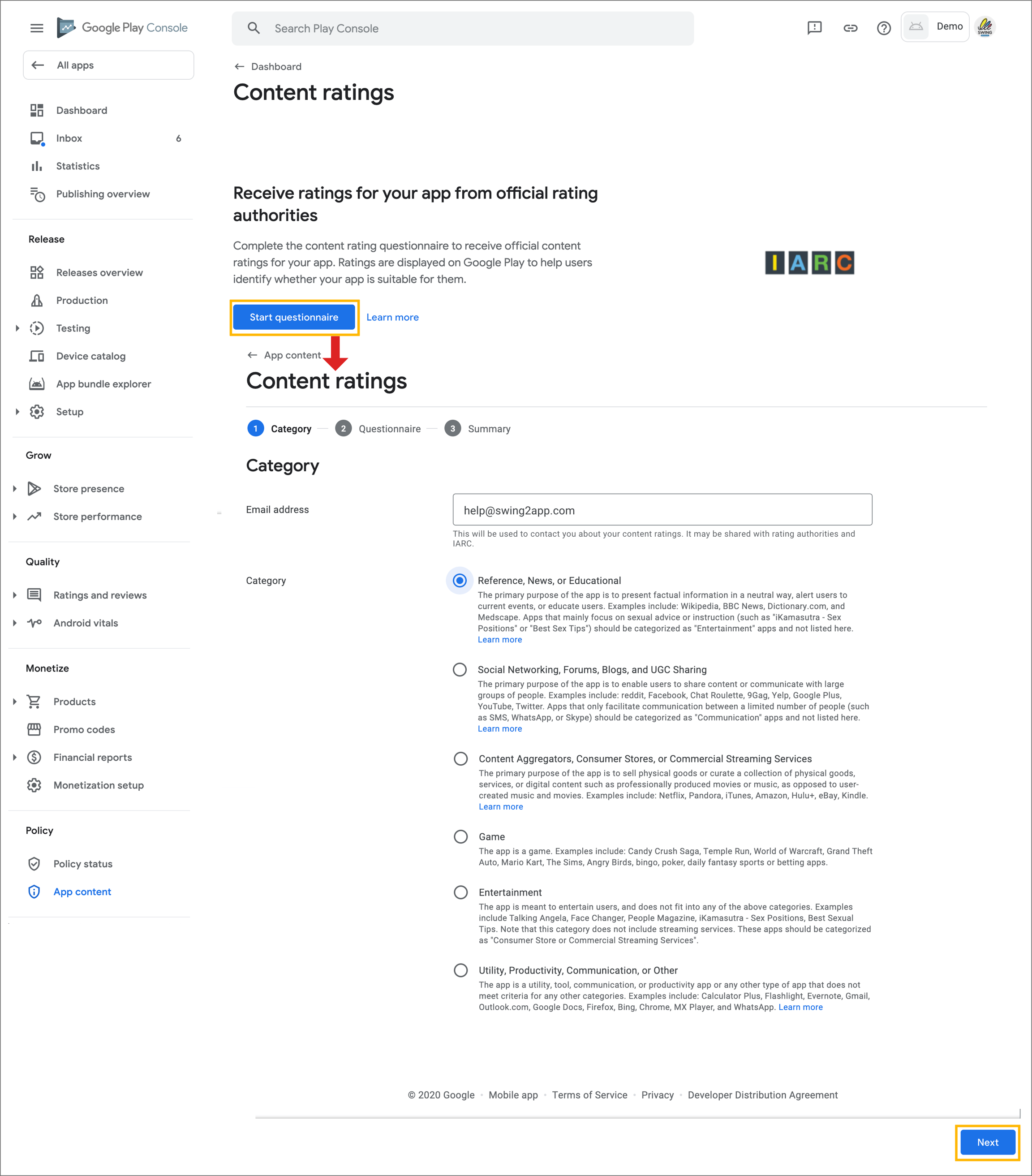 When you complete the questionnaire, a rating for your app will be calculated.