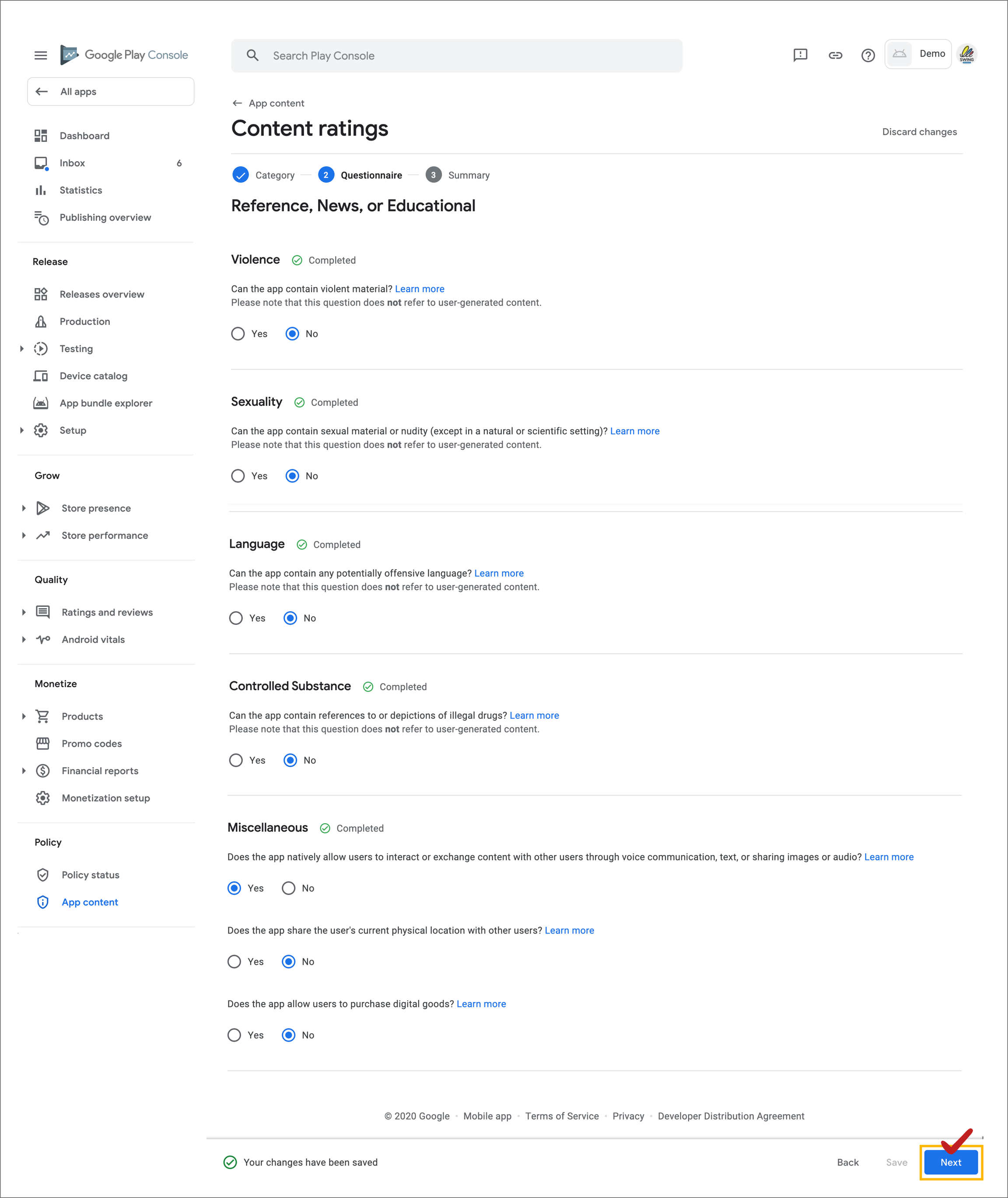 Example) If there is sexual material exposure in the app, you must check “Yes”, and if alcohol or drug content is included, you must check “Yes”.