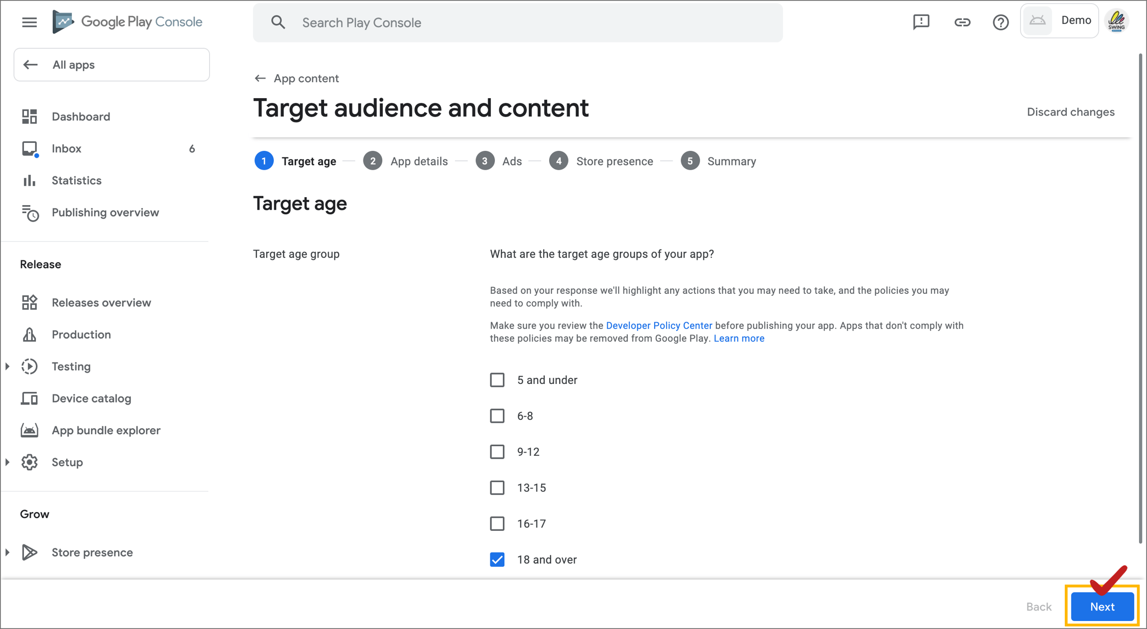 Therefore, except in special cases, check the age of the app as over 18 and select the [Next] button.