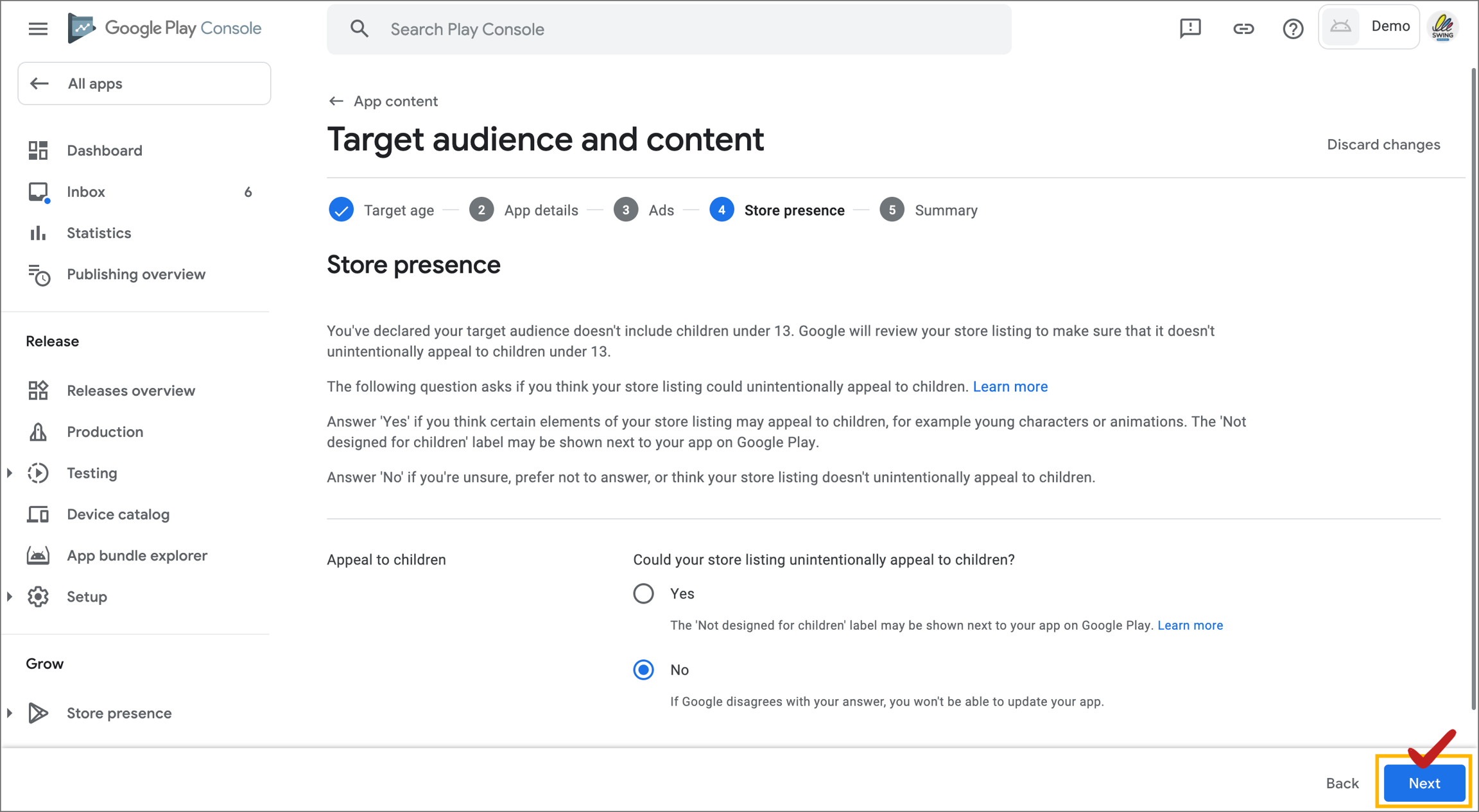 If the app you are submitting contains content that may attract children’s interest, or if you want to be confused, you should check “Yes”.
