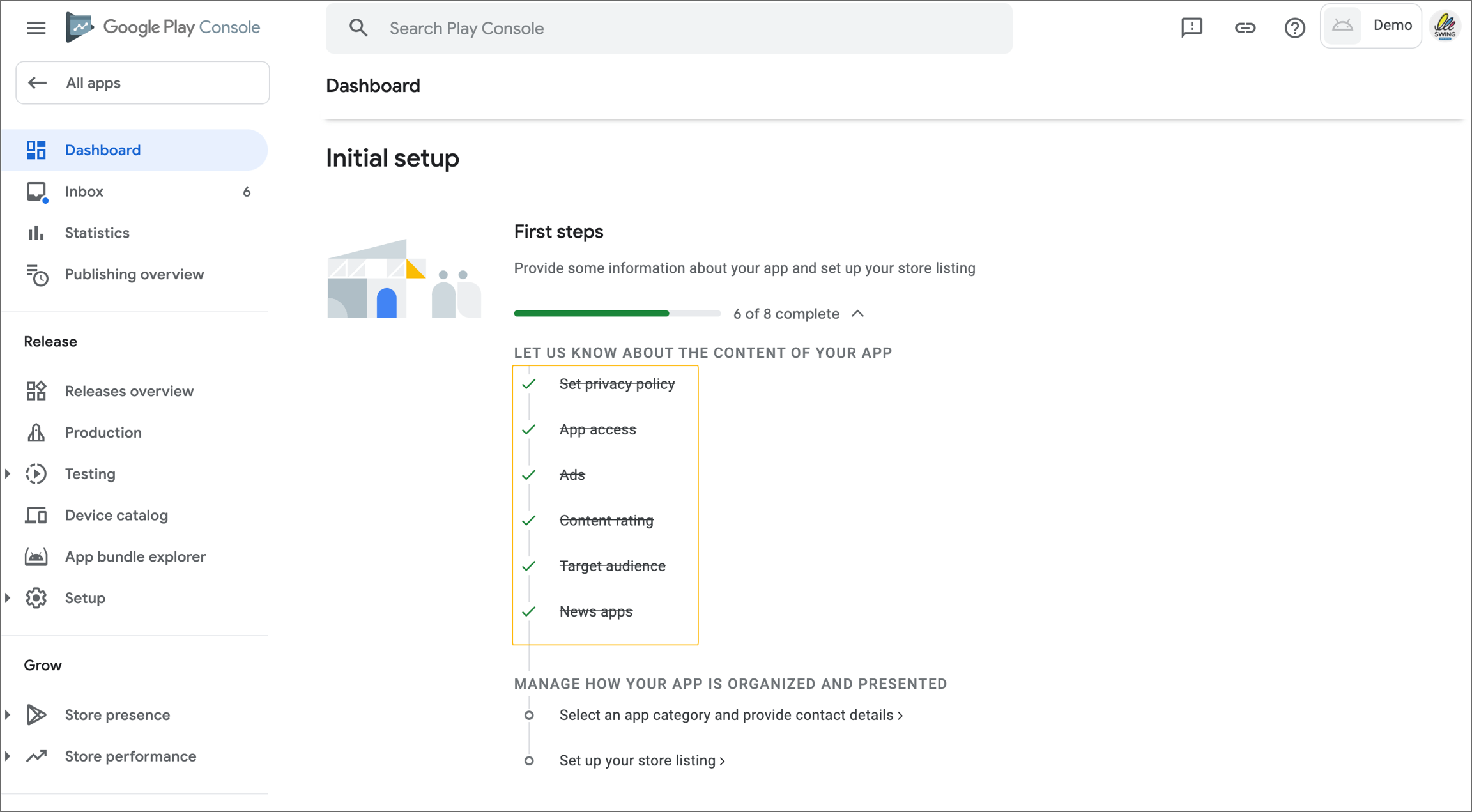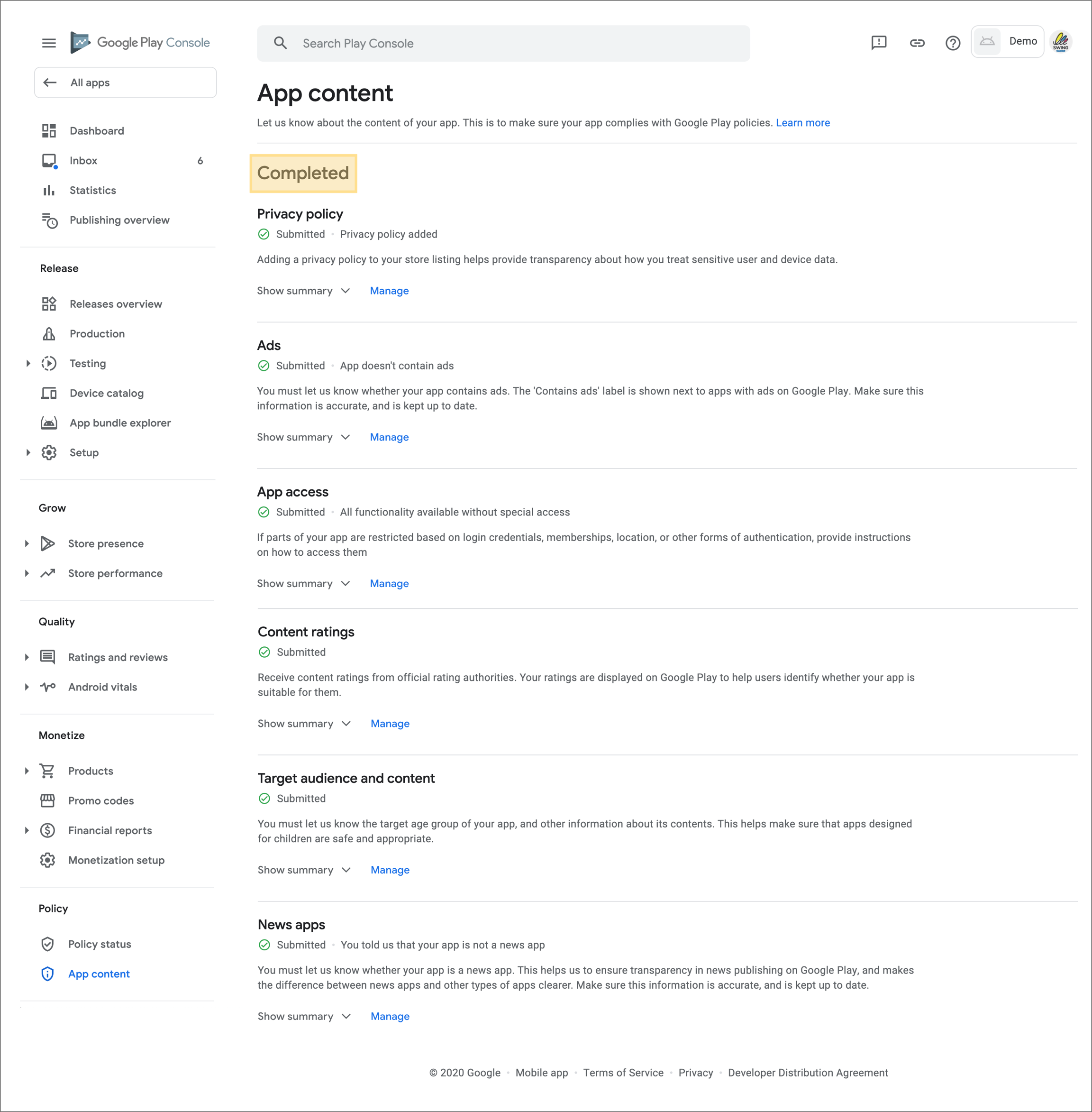 You are done when all of the app content items are illuminated in green and displayed as ‘completed’ at the top.