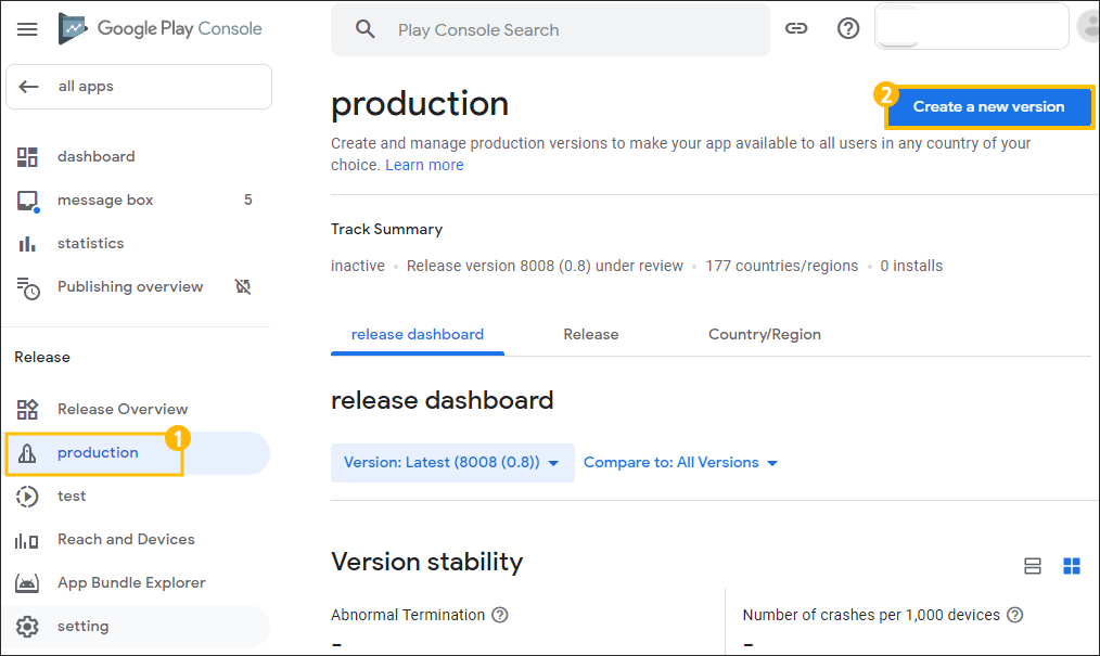Console site left menu 1) Select [Production] → 2) Select the [Create new version] button.
