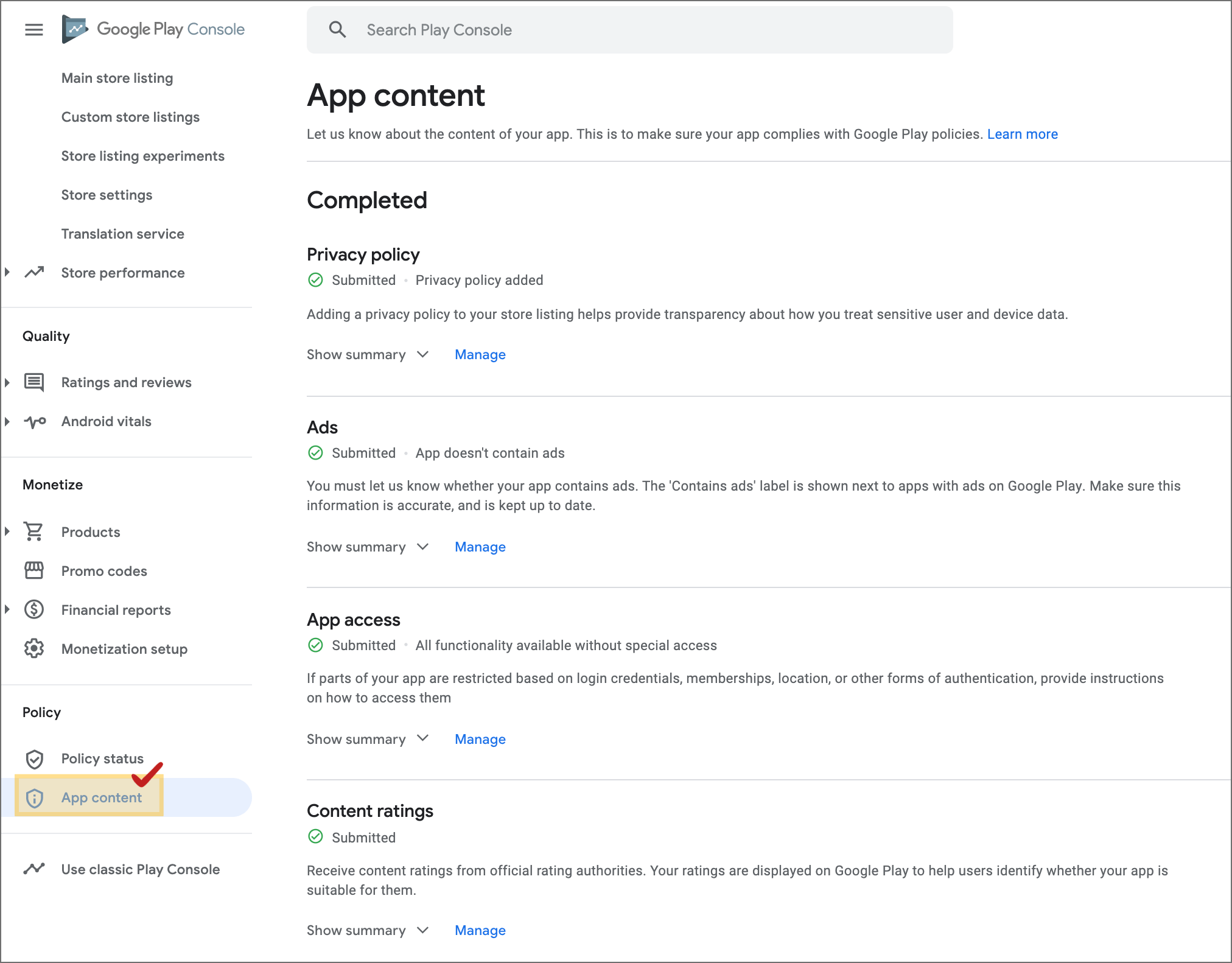 If you go to the Policy → App Contents page, you can edit the contents of each section.