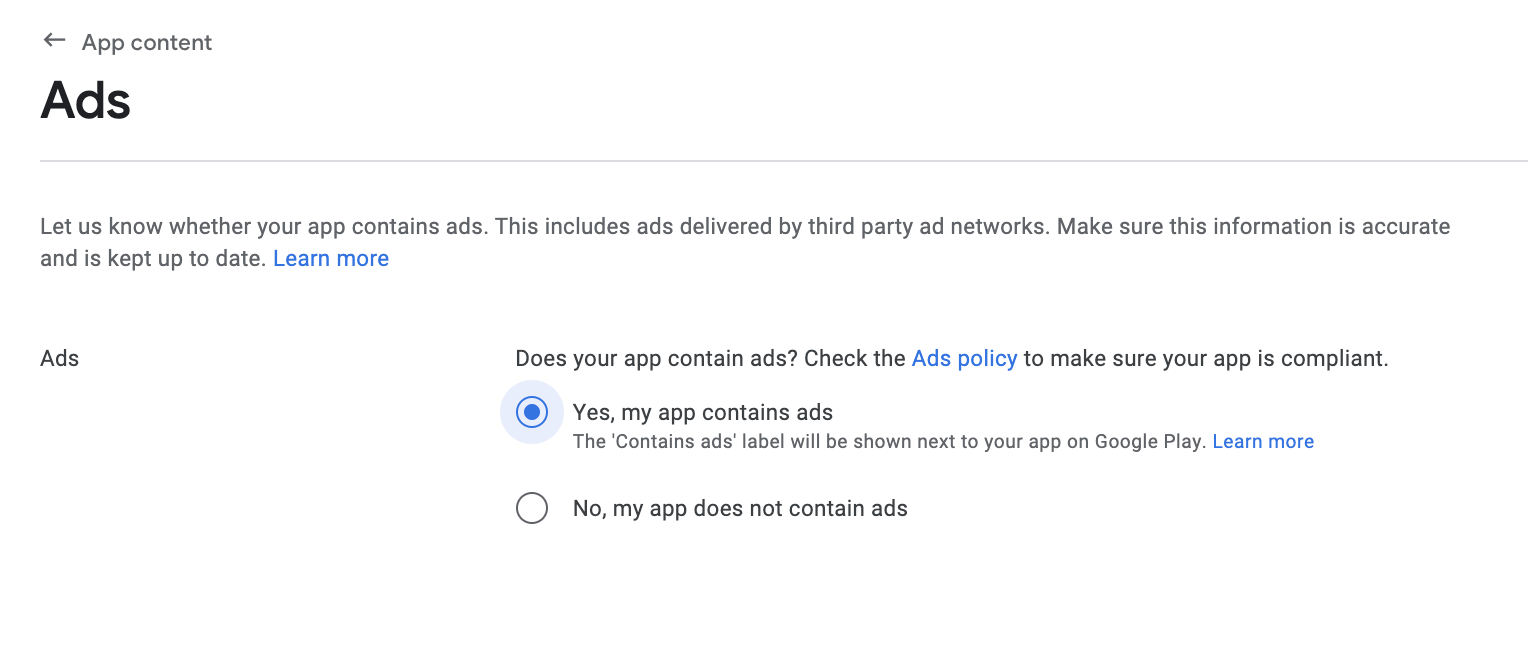 For example, if the version has been updated to contain ads after launching the app, you must check Include ads.